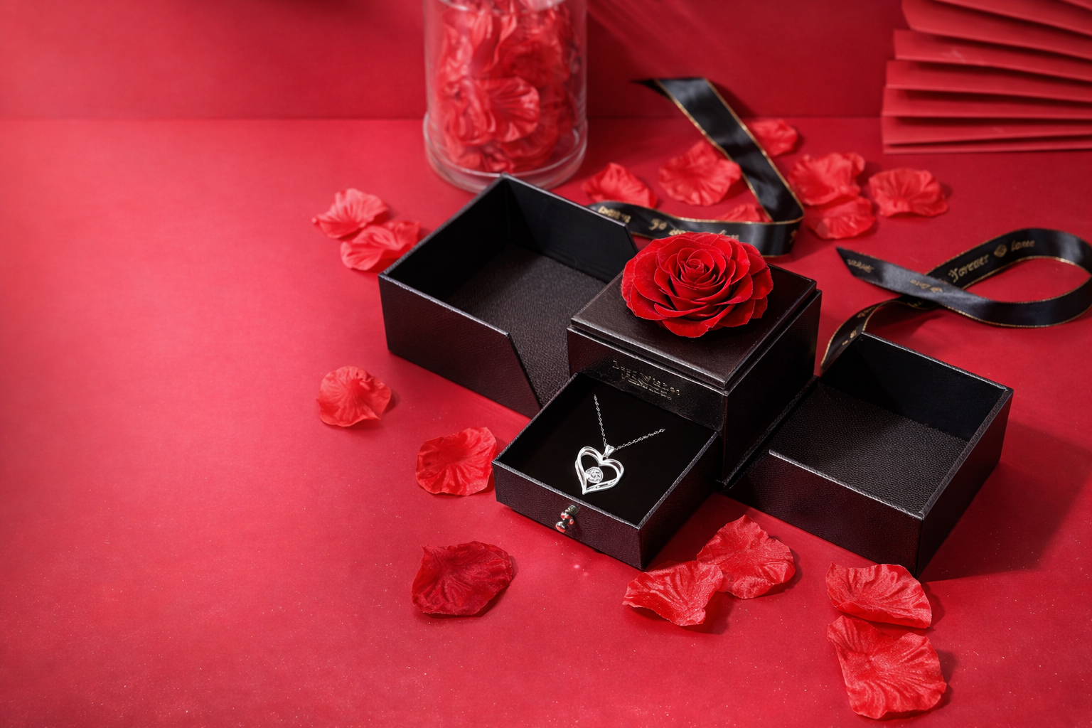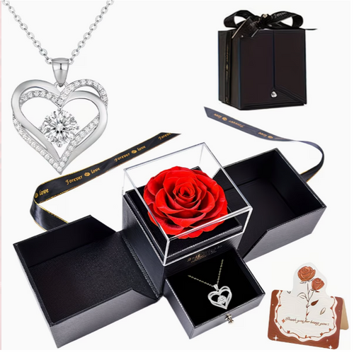 Wieczna róża z naszyjnikiem z zawieszką w kształcie serca w rozkładanym pudełku